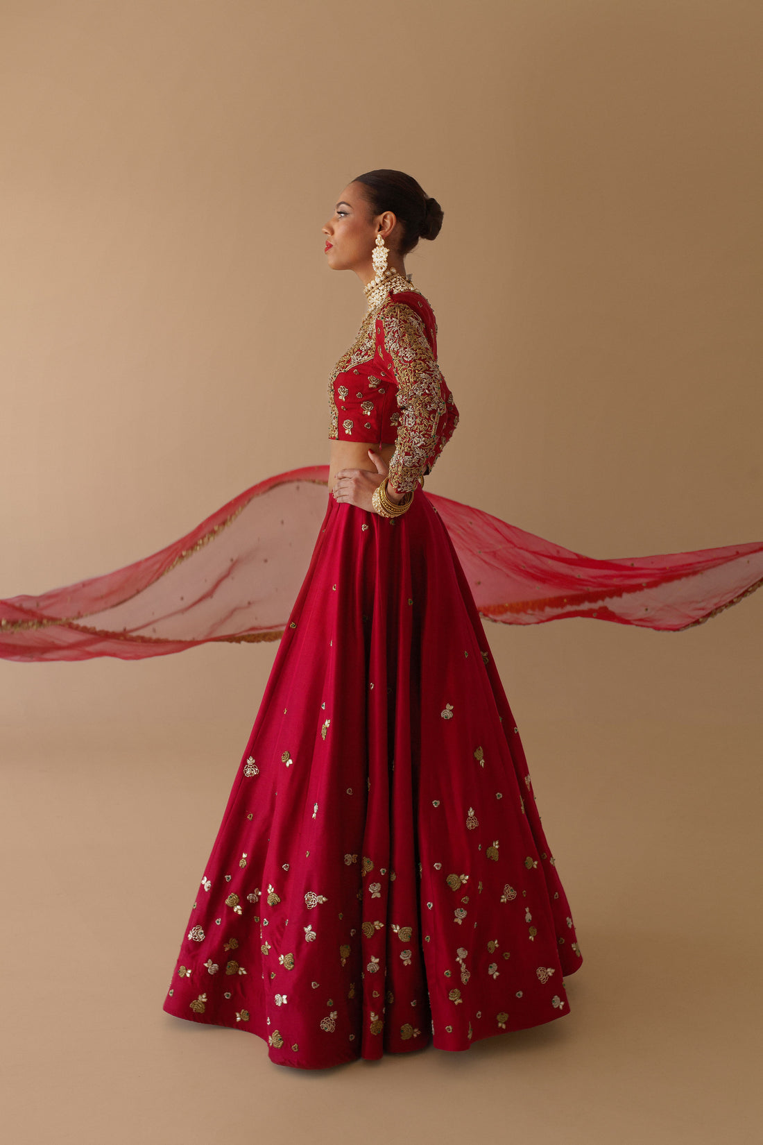 A red bridal lehenga crafted with pure raw silk fabric. It is hand embroidered with...