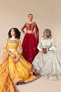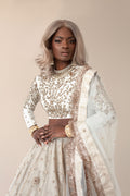 Ivory lehenga in tulle with hand embroidered metal thread flowers. A pure raw silk blouse with hand embroidery paired with a tulle dupatta