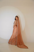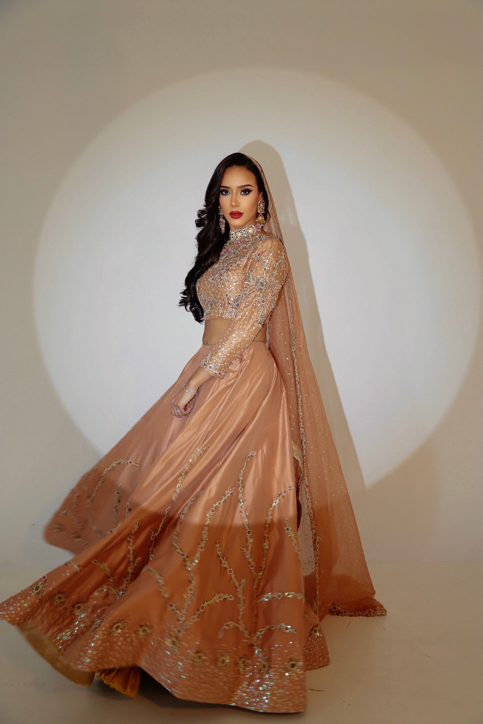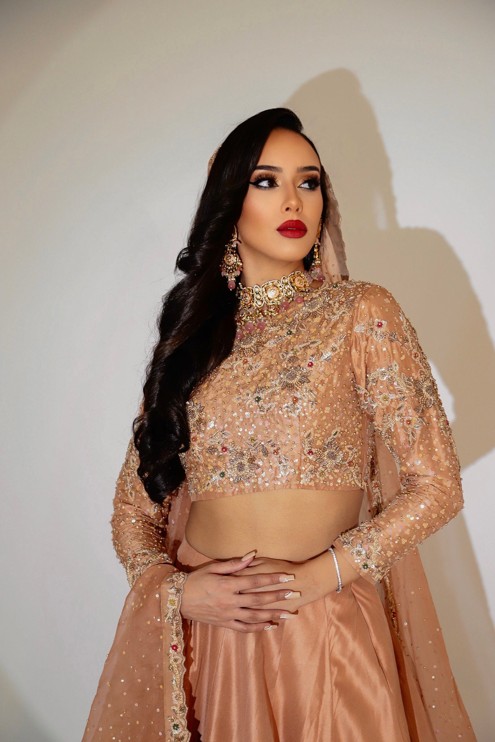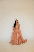 A pure raw silk lehenga with hand embroidery paired with a pure organza dupatta with embroidered borders.